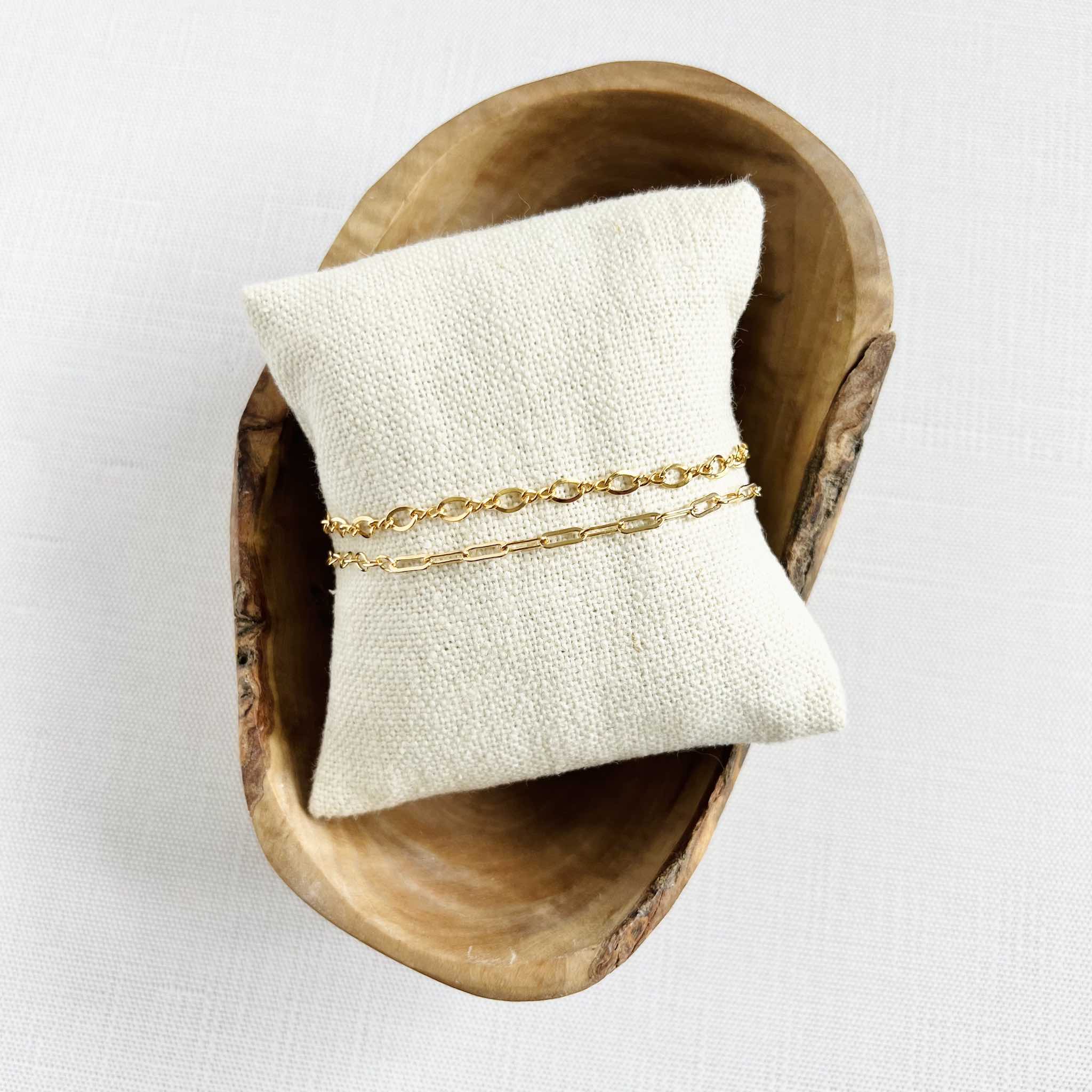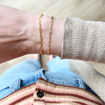 The Mini Paperclip Chain bracelet paired with a Figure 8 Cable Chain (both adjustable up to 7.5"!) make the perfect minimalist duo on your wrist! Pro Tip: Once the chain is secured on a comfortable setting on your wrist, carefully use scissors to cut off any extra dangling chain for a more seamless fit.