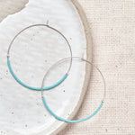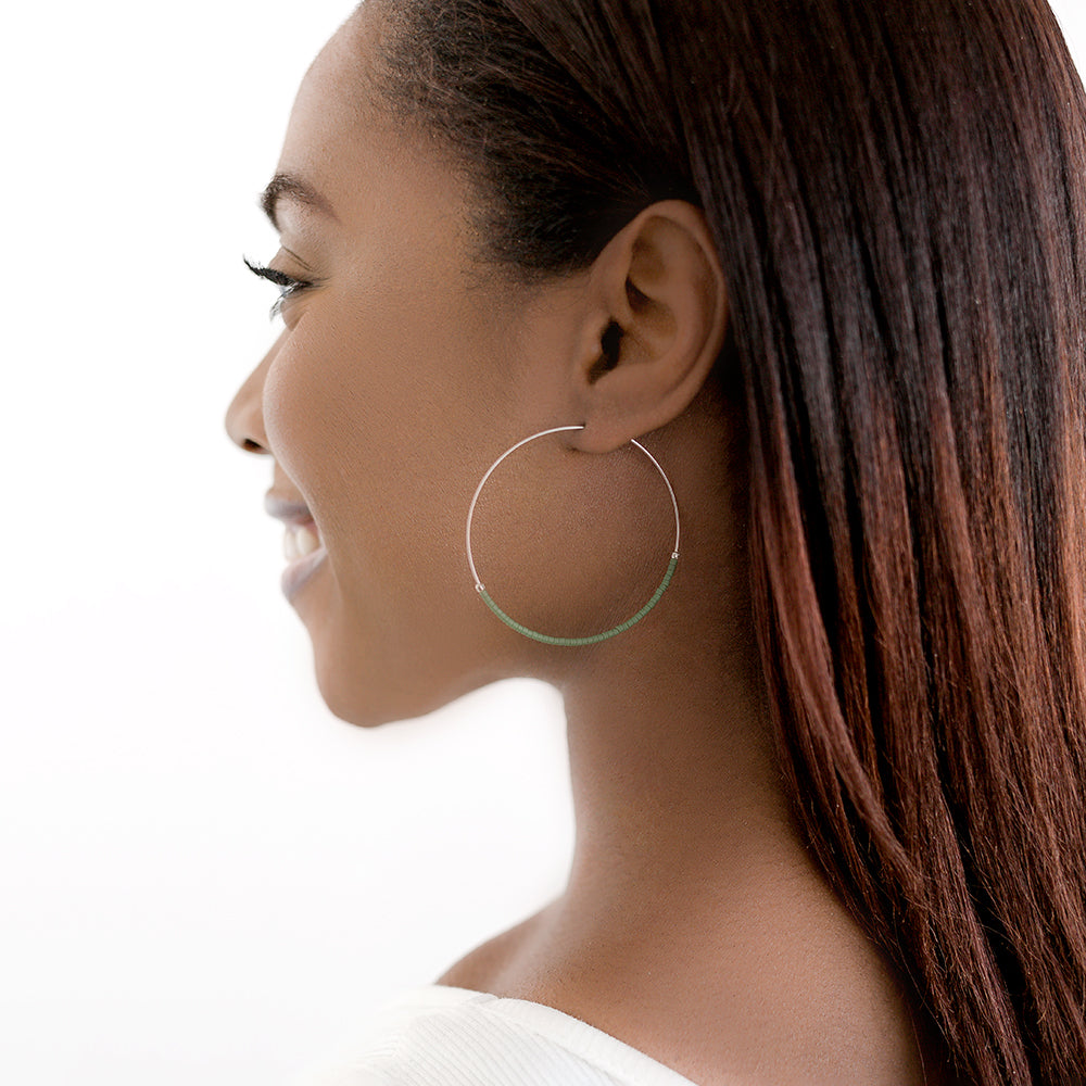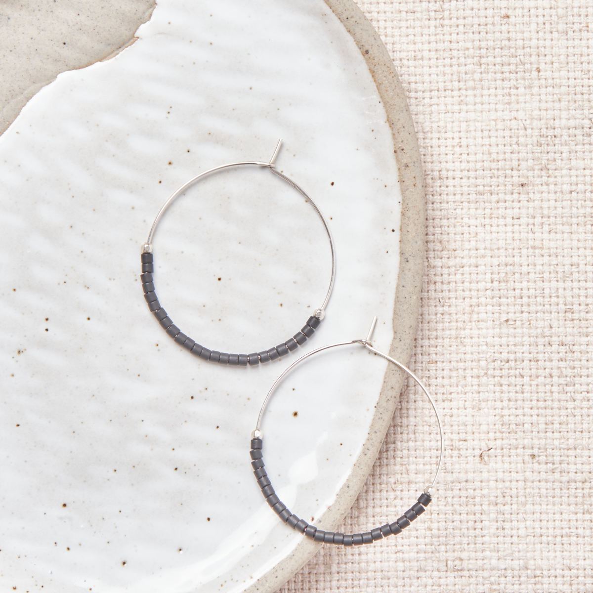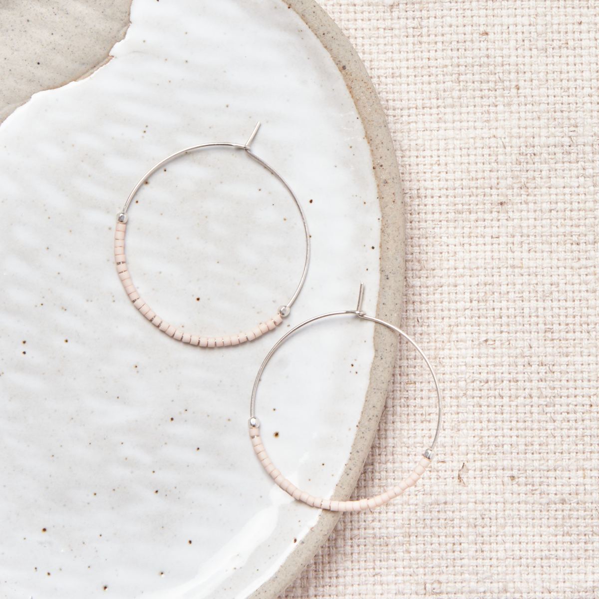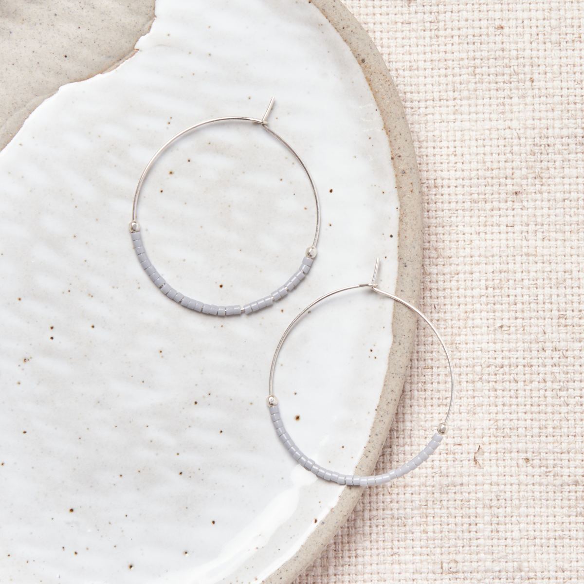 You can't go wrong with these minimalist + delicate hoops! Accented with silver + tiny glass beads, these earrings are ultra lightweight and the perfect touch to any outfit. They come in multiple colors + sizes, one for every mood!