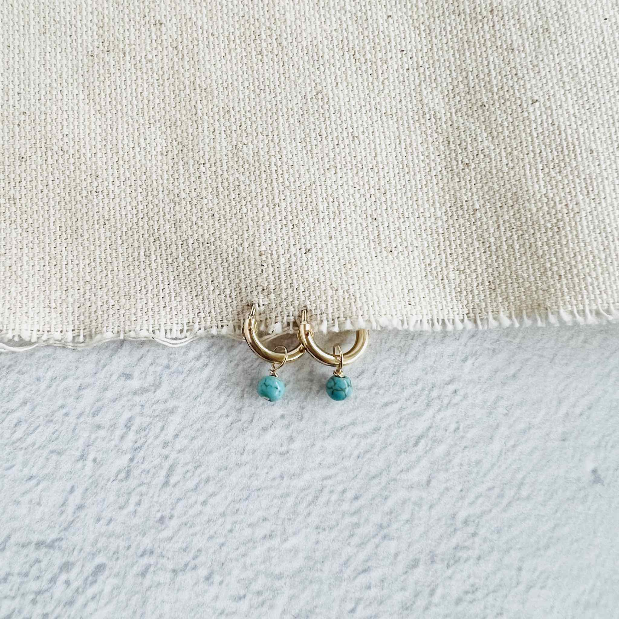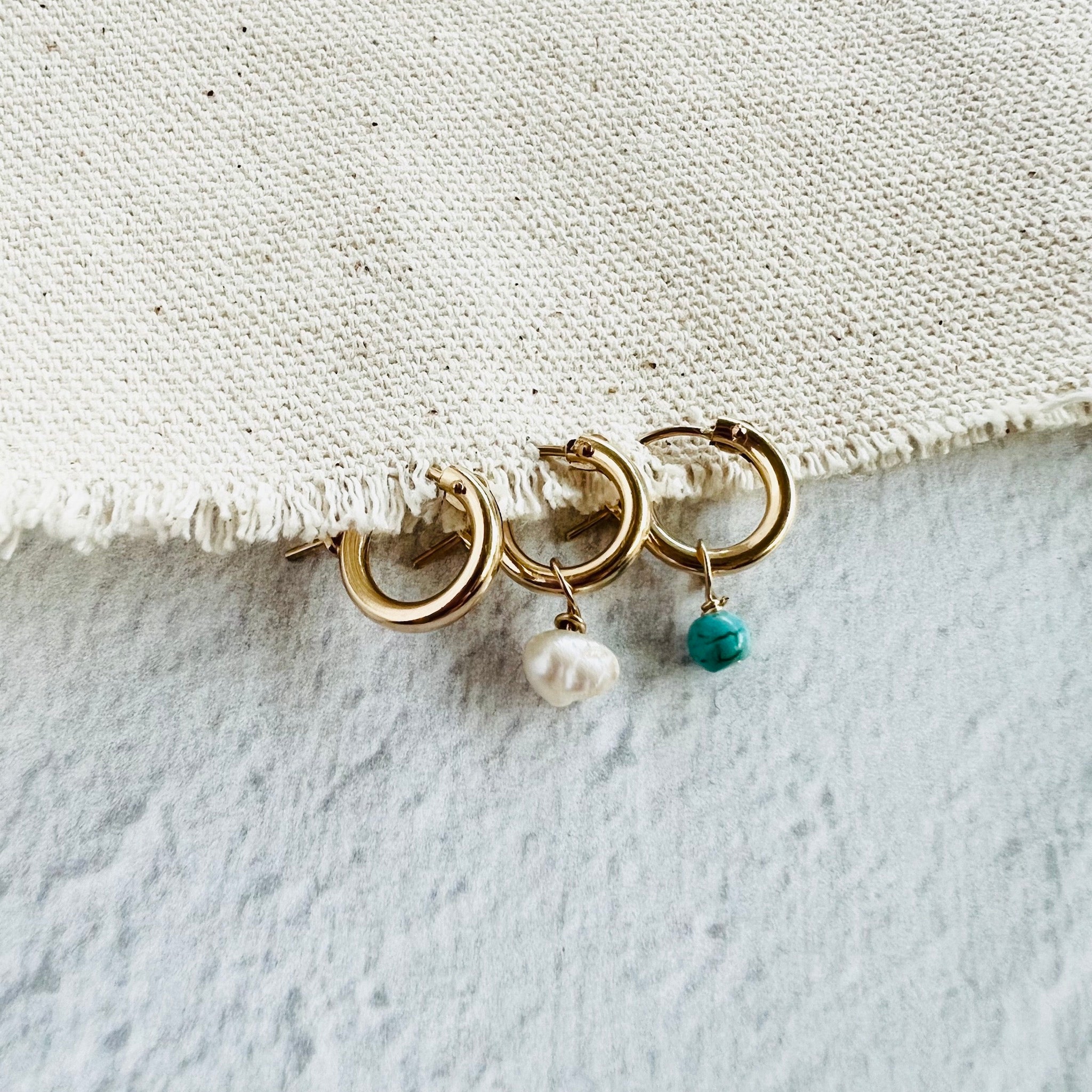 This pair of 12mm gold filled hoops come with removable turquoise and pearl attachments. 1 pair of hoops, 3 ways to wear. Consider this the only pair you need!