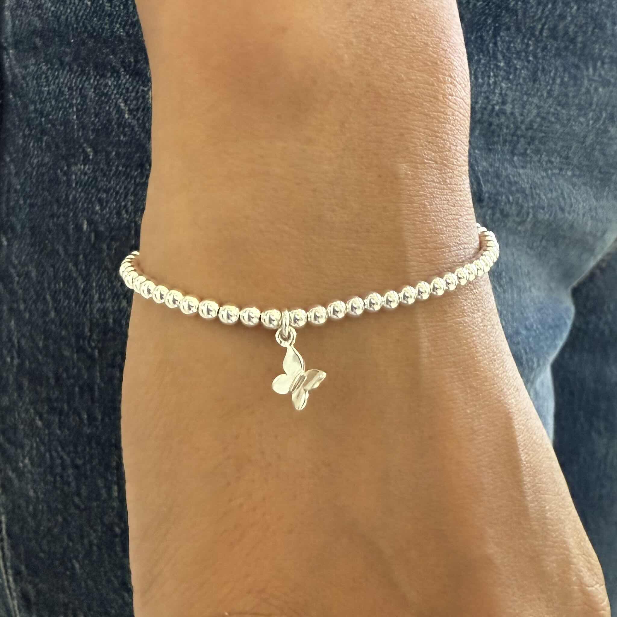 Butterflies remind us of growth, beauty, and new beginnings. Our Butterfly Charm Bracelet, featuring polished 3mm sterling silver beads and a delicate butterfly charm, is a wearable symbol of hope and transformation.