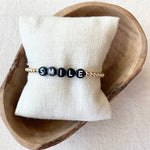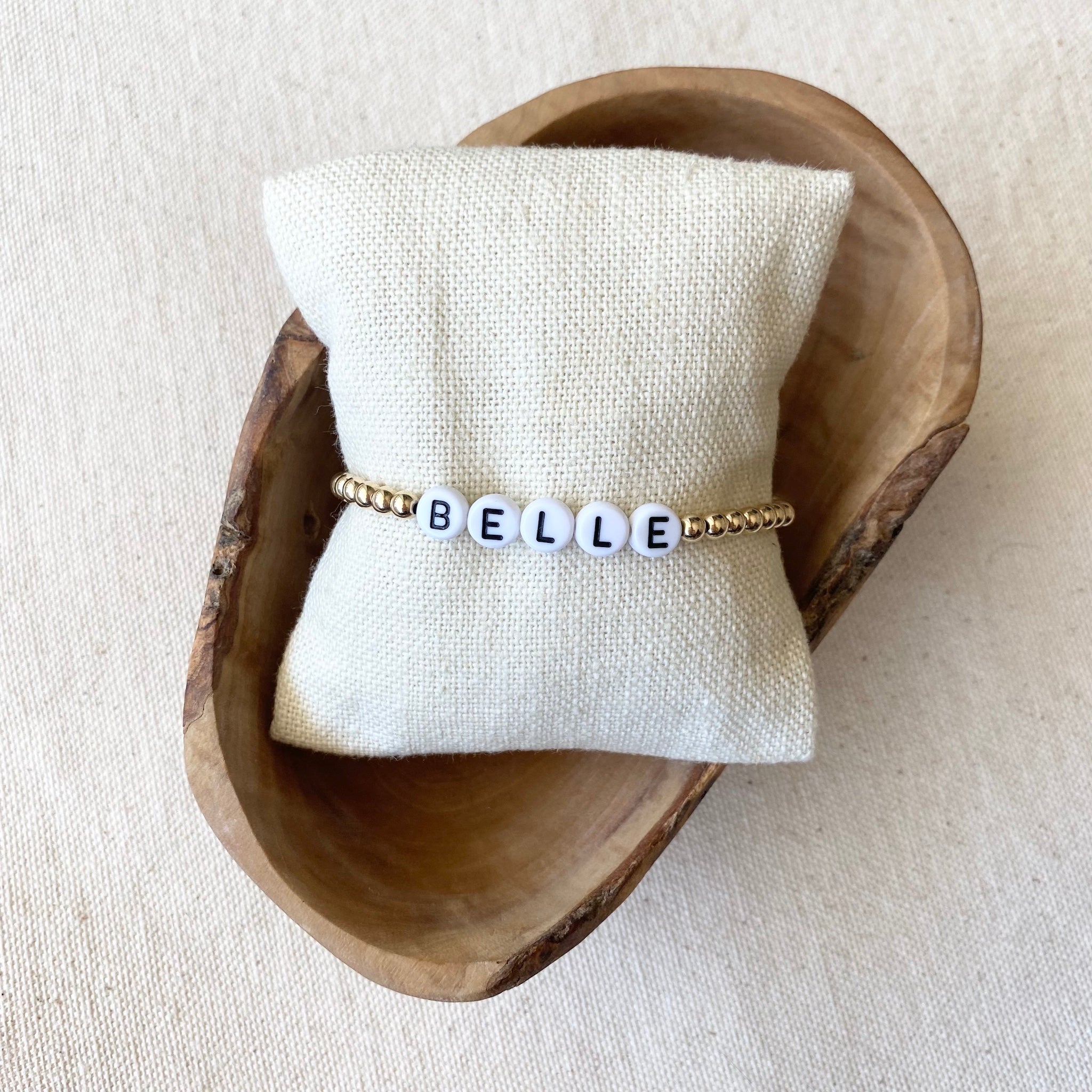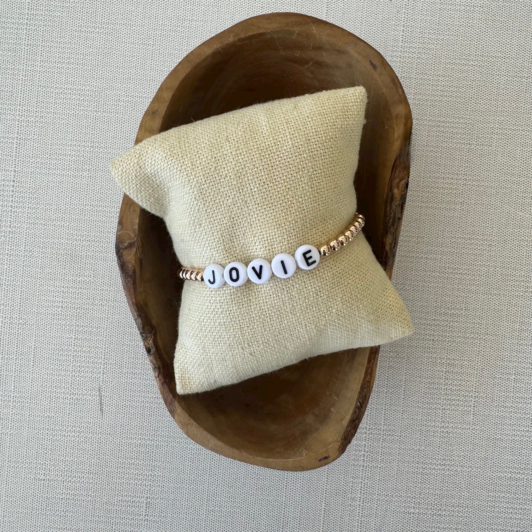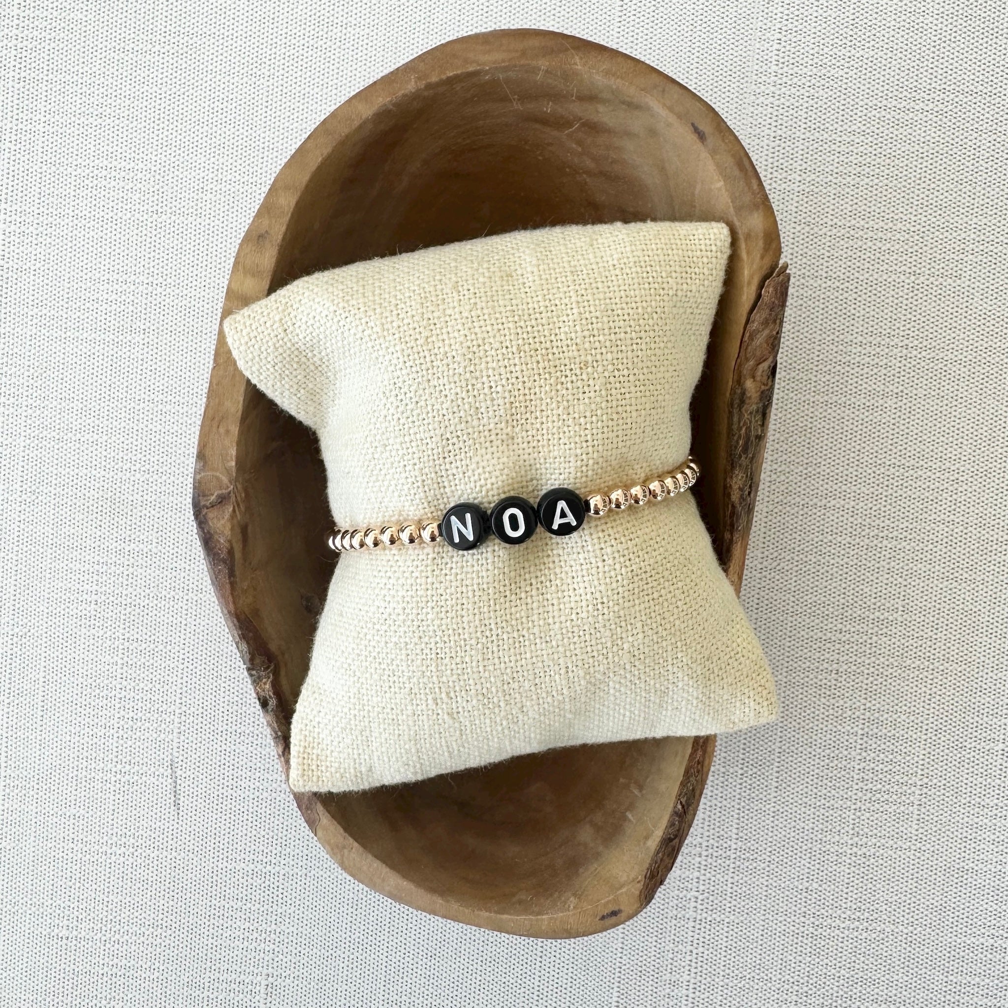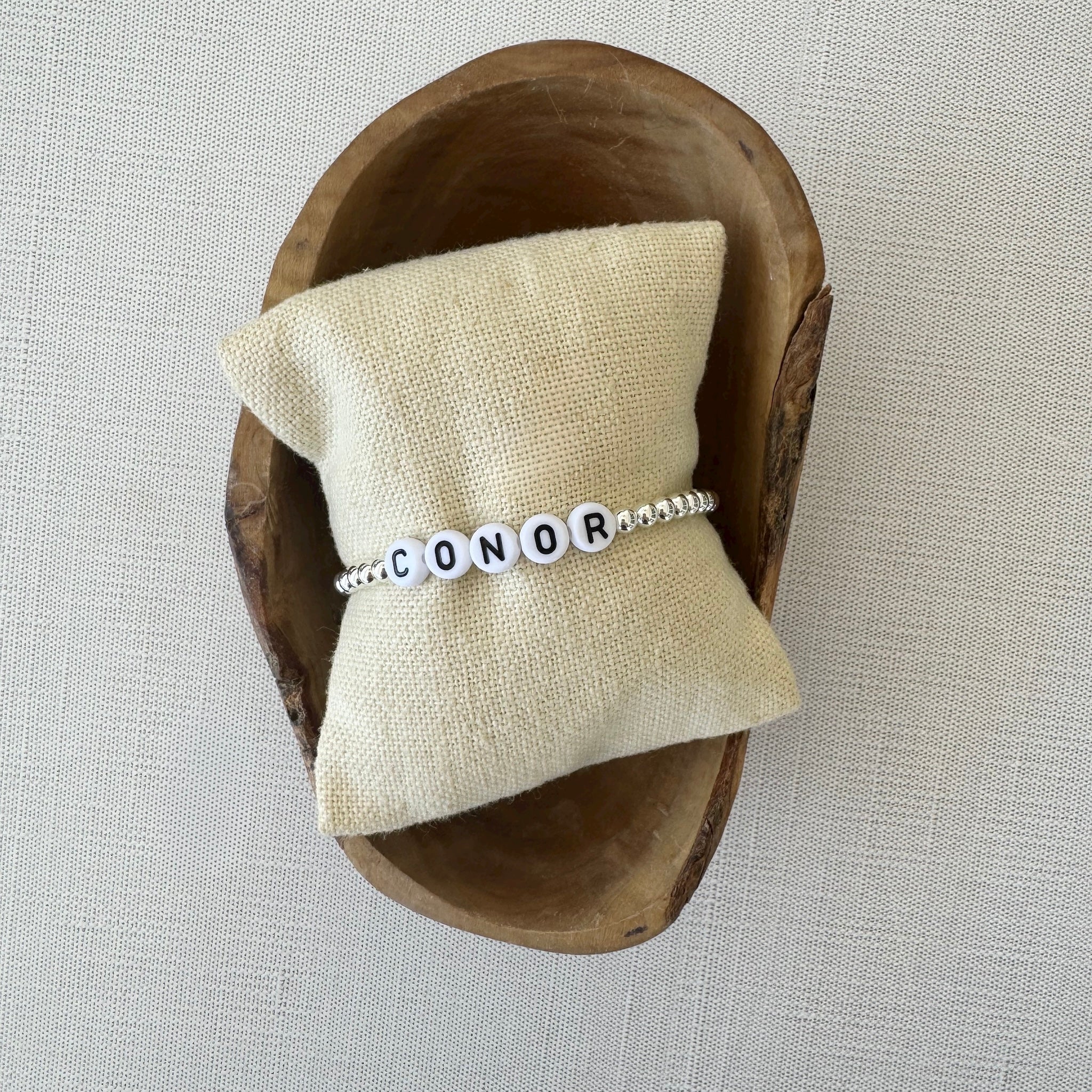 A special name or word, the initials of someone you love, your bridesmaids, thats the beauty of this bracelet! It's up to you to decide what you wear on your wrist. Up to 13 letters per bracelet. Available in black letters or white letters.