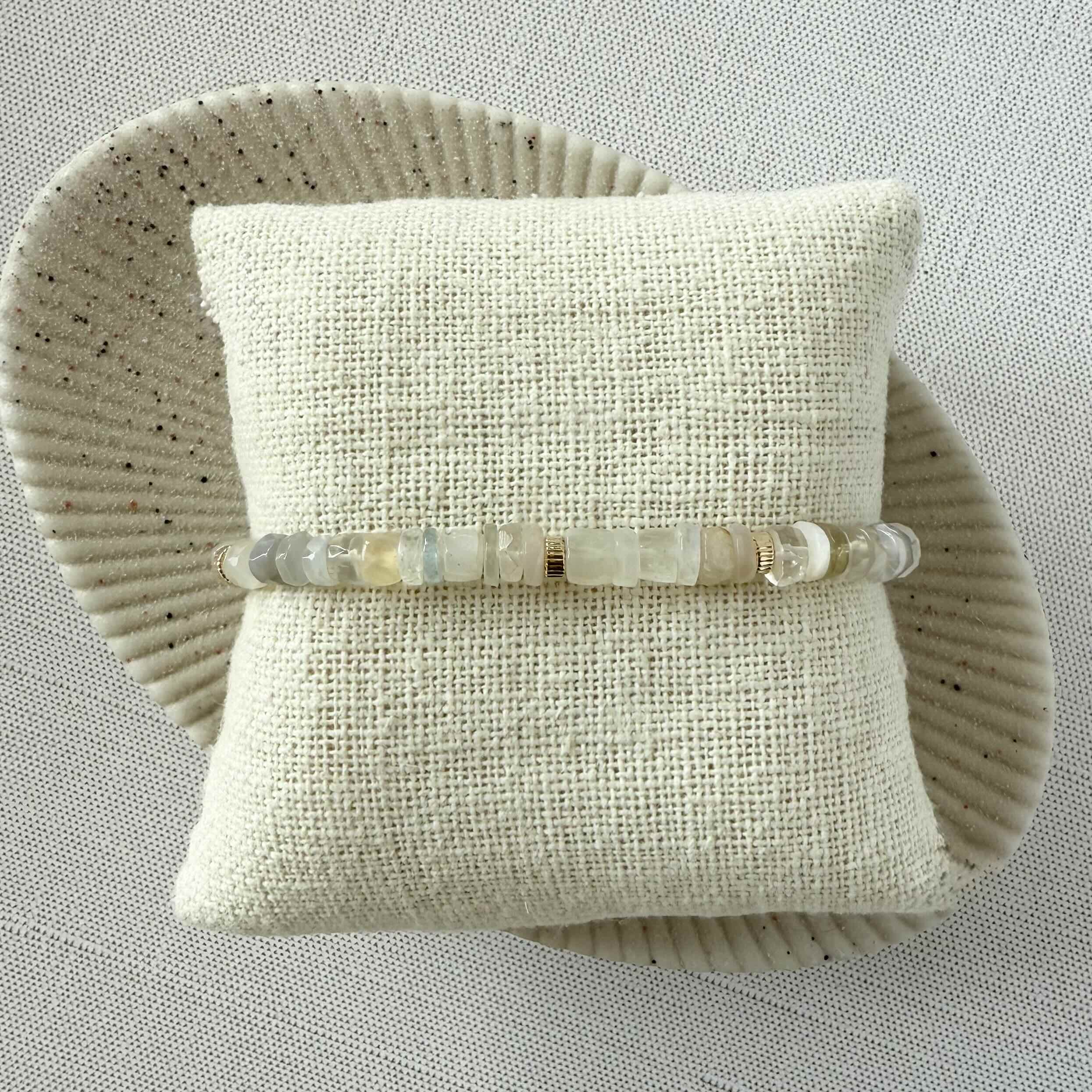 Meet the Dune Bracelet - a soft blend of genuine gemstones inspired by sun-warmed sand and seafoam skies. Each stone carries natural variation in tone and texture, creating a neutral palette that layers beautifully with gold or stands on its own for an understated, effortless look.