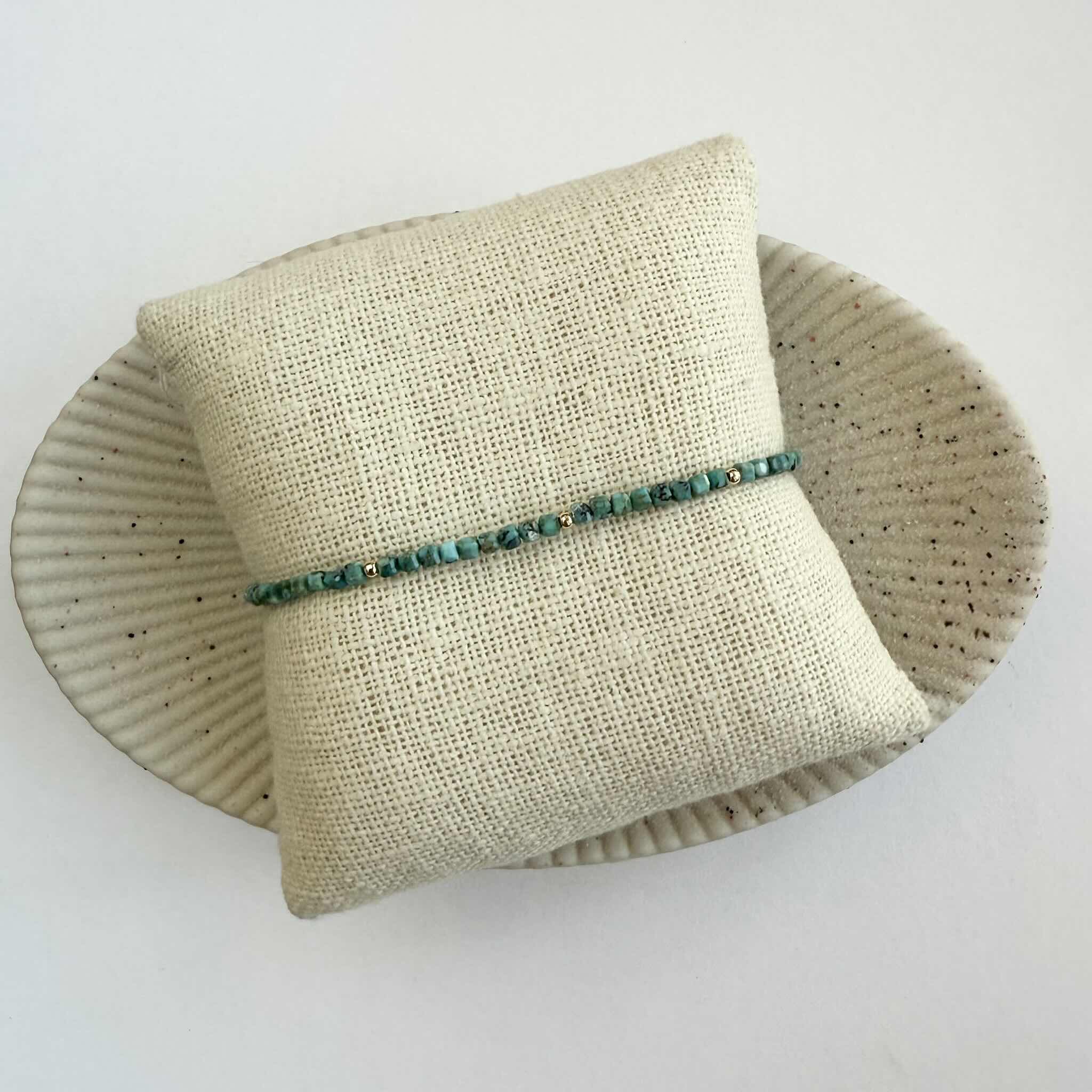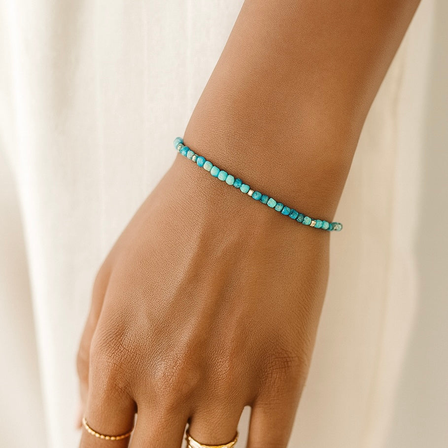 Meet the Kaiya Turquoise Bracelet – a petite square-beaded design inspired by the calm of the sea and the strength of the earth. Turquoise has long been cherished as a stone of serenity and protection, and here it’s reimagined in a modern, minimal silhouette you can wear every day.
