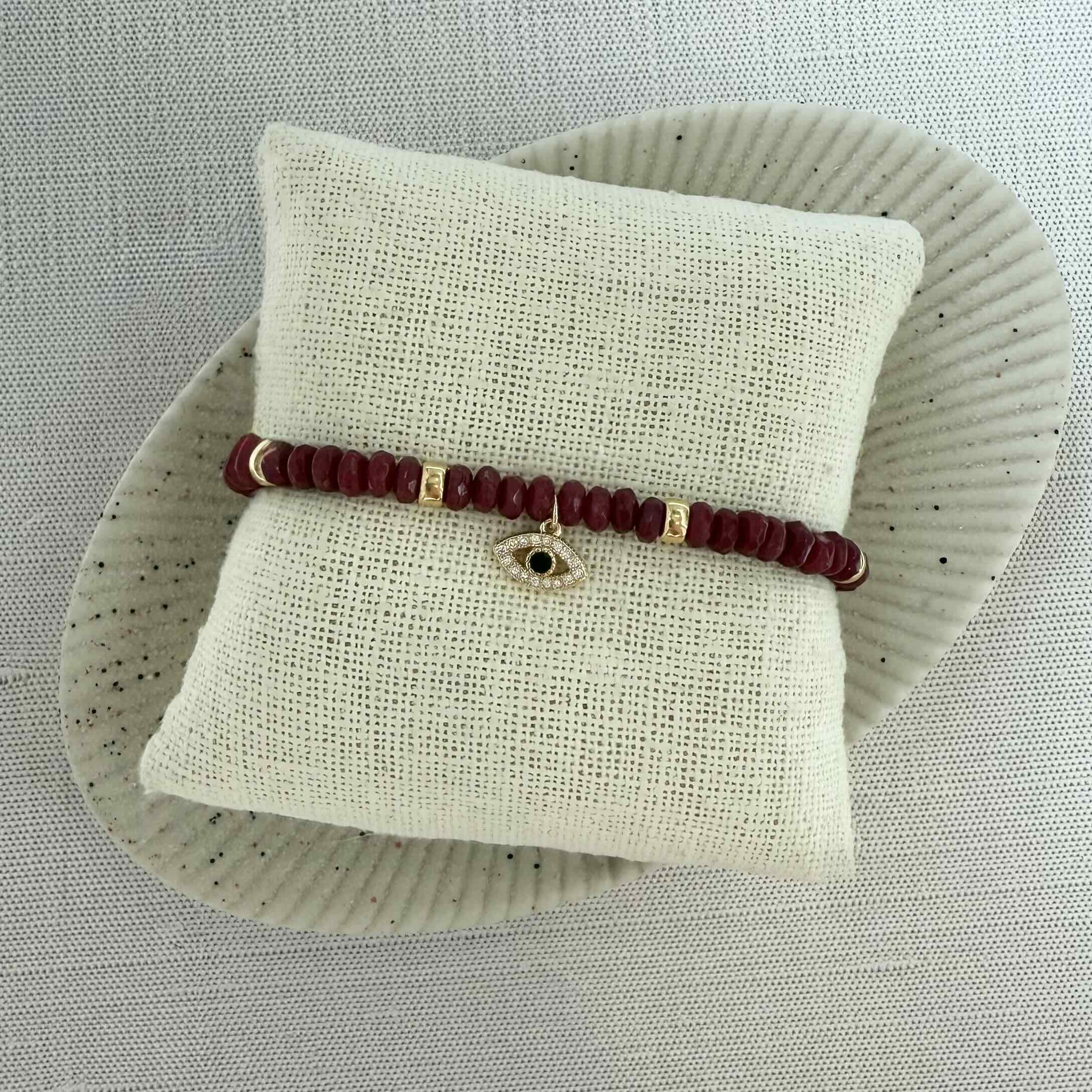 Radiate strength and protection. This bracelet features genuine ruby gemstones — known for passion, courage, and vitality - accented with an Evil Eye charm to ward off negativity. A timeless blend of beauty and meaning, it’s the perfect piece to layer or wear solo as your signature symbol of confidence and energy.