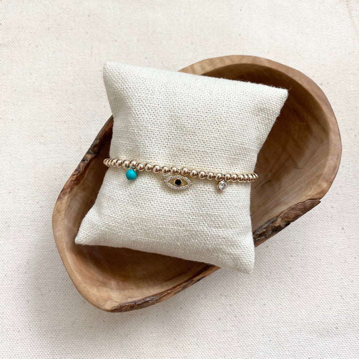 This everyday bracelet features 4mm gold-filled or sterling silver beads, a turquoise charm known for protection and good energy, and a twinkling crystal accent to catch the light—and maybe a little luck too.