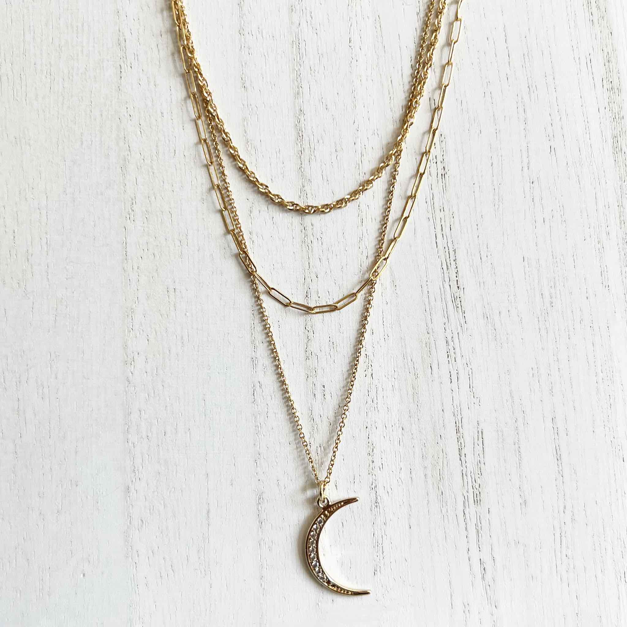 This set is made up of the Crescent Moon Necklace , the Rope Chain and the Paperclip Chain. This is your go to set for a minimalist, layered look.